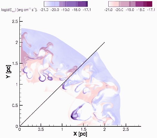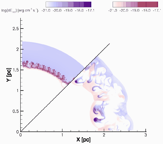 Figure 6 shows the radiative energy loss of Models WR0 and WR15 corresponding to the density plots in Fig. 3. In the figure, only the material between the forward and reverse shock is visible. The material outside this region does not have a high enough temperature to emit enough radiation compared to the other components. In the first slice the Rayleigh-Taylor instabilities dominate, while in the second slice the high density clumps are most apparent. WR0 also shows that the RT instabilities are composed of both circumstellar material and SN ejecta. In the second slice the clumps are by far the most visible feature in the SNR, brighter by more than 2 orders of magnitude when compared to other material in the SNR. Although we believe that the qualitative result of the radiative energy loss is valid, one has to be cautious when looking at the results qualitatively. For instance, non equilibrium ionization and higher metal composition would increase line emission and are thus expected to increase the cooling rates.