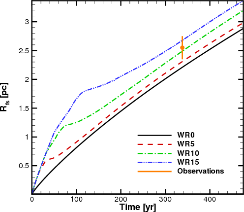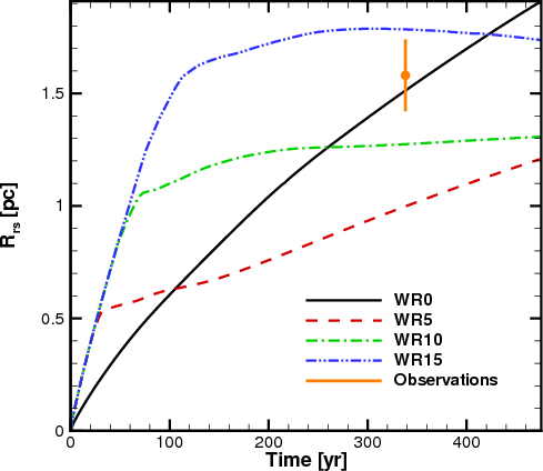The comparison of the results for the reverse shock radius (Fig. 9) and the observations tell us more, since there is a clear difference between the models. For the models with a WR shell there are two important parameters which determine the radius of the reverse shock. The first is the radius at which the WR shell was located at the time of the supernova explosion, since that determines the time frame during which the supernova ejecta could expand freely. This is reflected in the different turn off times of the initial fast increase in the reverse shock radius for the models which contain a WR phase. Model WR0 does not expand as fast initially because the supernova ejecta encounter a higher density CSM, corresponding to the RSG wind, which creates a reverse shock that initially moves more slowly.