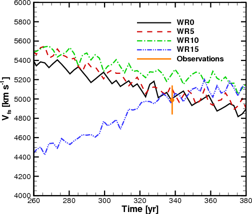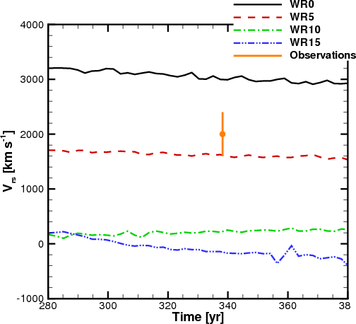 Figure 10: Similar to 8, but in this case the reverse shock velocity is plotted. The models with a longer WR life time have a more massive WR shell which causes a higher inward velocity of the reverse shock. The model with the highest WR shell mass should thus show the largest inward reverse shock velocity in our frame, which is consistent with our results. |