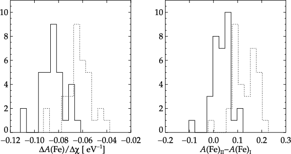 To constrain the cluster metallicity and microturbulence values, we calculated iron abundances from Fe I and Fe II lines for the UVES sample. The ionisation and excitation equilibrium of Fe also provide an additional check of the derived stellar parameters. We selected 48 unblended Fe I lines that have oscillator strengths determined by O'Brian et al. (1991) and 14 Fe II lines that have oscillator strengths determined by Biemont et al. (1991), Raassen & Uylings (1998), or Fuhr et al. (1988). Equivalent widths were measured by fitting Gaussian line profiles to the observed, fixing the FWHM of lines weaker than 5 pm to the average value for each individual star. In the GIRAFFE spectra only very few Fe I and Fe II lines are available and it is not possible to obtain reliable measurements for the fainter half of the sample. Table 3 lists all Fe I and Fe II lines with references to the adopted