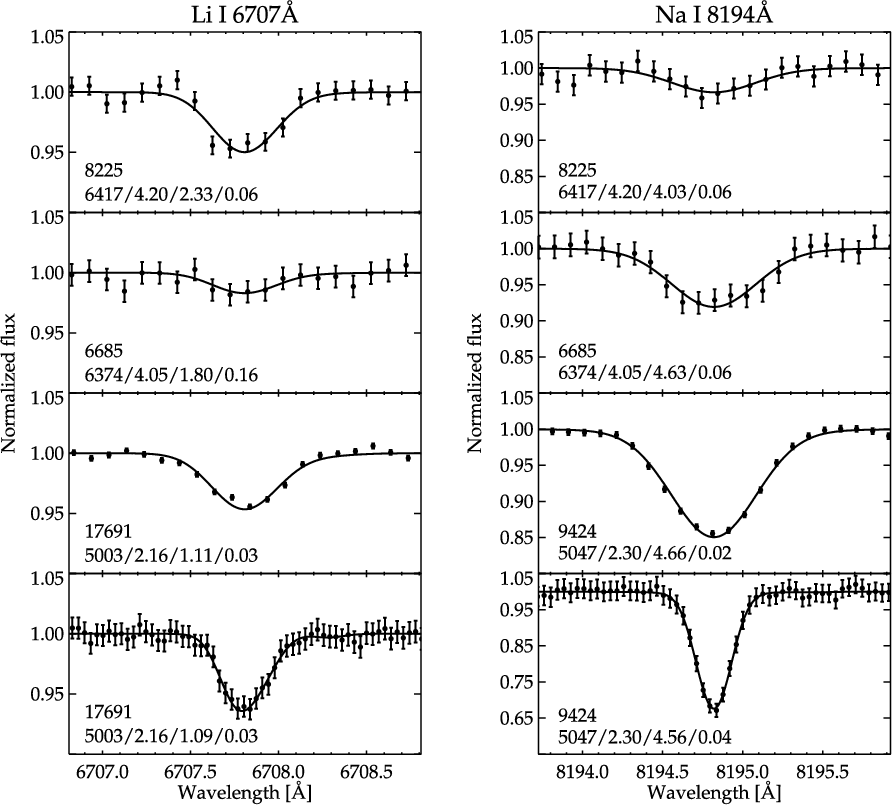 For the abundance analysis we used a grid of 1D, LTE, plane-parallel and spherical, MARCS model atmospheres (Gustafsson et al. 2008). LTE abundances of Li and Na were derived from spectrum synthesis, using the Uppsala code BSYN. Non-LTE abundance corrections were thereafter applied. LTE abundances of Fe and Ca were derived from equivalent width measurements, using the corresponding Uppsala code EQWIDTH.