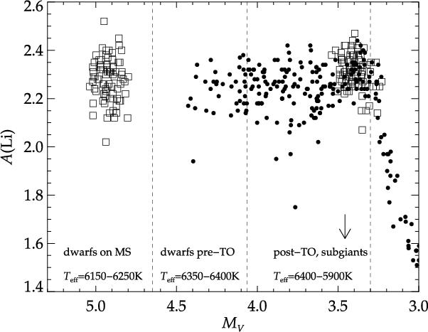 Charbonnel & Primas (2005) revisited the literature Li data for halo field stars with particular focus on the evolutionary status of the sample stars. This study discovered for the first time that the mean Li value appear to be higher for the turn-off (TO) and SGB stars than for the dwarfs. This result, together with the finding that all halo stars with Li abnormalities (i.e., strong deficiency or high content) lie on, or originate from, the hot side of the plateau, lead the authors to suggest that the most massive (i.e., post-MS) of the halo stars still observable today have had a different Li history than their less massive dwarf counterparts. Charbonnel & Primas suggested that such a behaviour may be the signature of a transport process of chemical elements and angular momentum whose efficiency changes on the blue edge of the plateau. This behaviour corresponds to that of the generation and filtering of internal gravity waves in both Population II and I stars (Talon & Charbonnel 2003; Charbonnel & Talon 2008). Talon & Charbonnel (2004) describe how internal gravity waves coupled with rotation-induced mixing are expected to lead to higher Li homogeneity among the plateau dwarf stars than among the more massive, slightly evolved stars, a scenario which may explain the observational findings by Charbonnel & Primas. Speaking in favour of this model is its ability to simultaneously explain the internal solar rotation profile and the time evolution of the Li abundance at the surface of solar- and F-type stars as seen in Galactic open clusters (Charbonnel & Talon 2005).