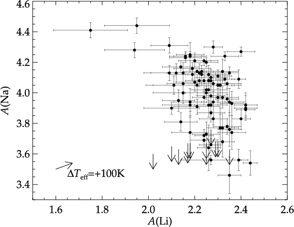 Unfortunately, the detection of the Na I doublet at 615.4/616.0 nm proved to be realistic only for the brightest targets of our sample, therefore preventing conclusions on the existence of a Li-Na anti-correlation. To overcome this problem, we proposed to observe a stronger Na I doublet (at 818.3 nm and 819.4 nm,) and were granted 3 h through the Director General Discretionary Time channel in Aug. 2008. Because of the limited time request we carefully selected a sub-set of our initial sample, mainly including the brightest TO and SGB stars (in total, 117 stars), with both high and low Li. For these observations, we used the high-resolution GIRAFFE set-up H805.3A (also known as HR19A, characterised by R=14 000 and spectral range 774.5-833.5 nm), in combination with the UVES Red 860 set-up (R=47 000, spectral range 760-1000 nm).