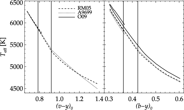 The cluster uvby-photometry was used to calculate effective temperatures for the whole sample. We implemented a number of different calibrations based on the colour indices (v-y) and (b-y) and c1. Table 2 lists effective temperatures calculated using the relations published in Alonso et al. (1996) and Alonso et al. (1999, hereafter these two papers are referred to as A9699), Ramírez & Meléndez (2005, hereafter RM05), and Önehag et al. (2009, hereafter O09). The first three are calibrated on the infra-red flux method (IRFM), whereas the last is based on theoretical colours from MARCS model atmospheres (Gustafsson et al. 2008). For all stars we assumed