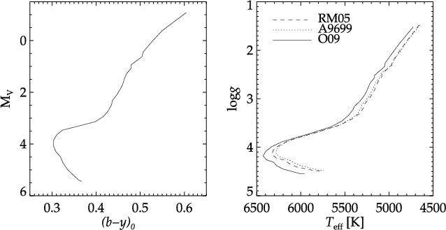 Figure 2: Left: the (b-y)0-MV fiducial used to derive stellar parameters. Right: the three (b-y)-based stellar-parameter sets. |