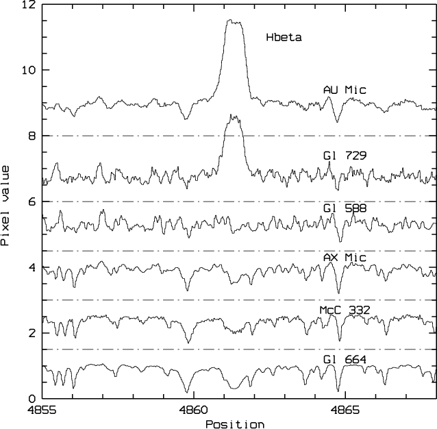 line for six dwarfs. It appears as weak absorption with possible weak wing emission in AU Mic. The region of the Pa8 line was observed but the line was not detected.