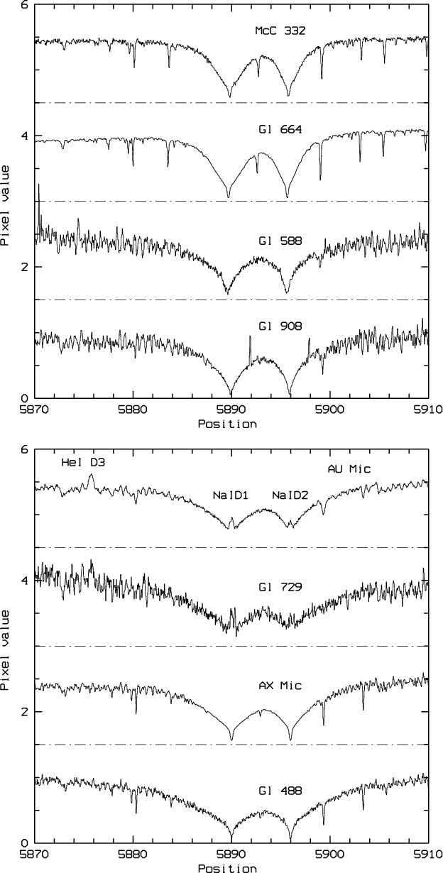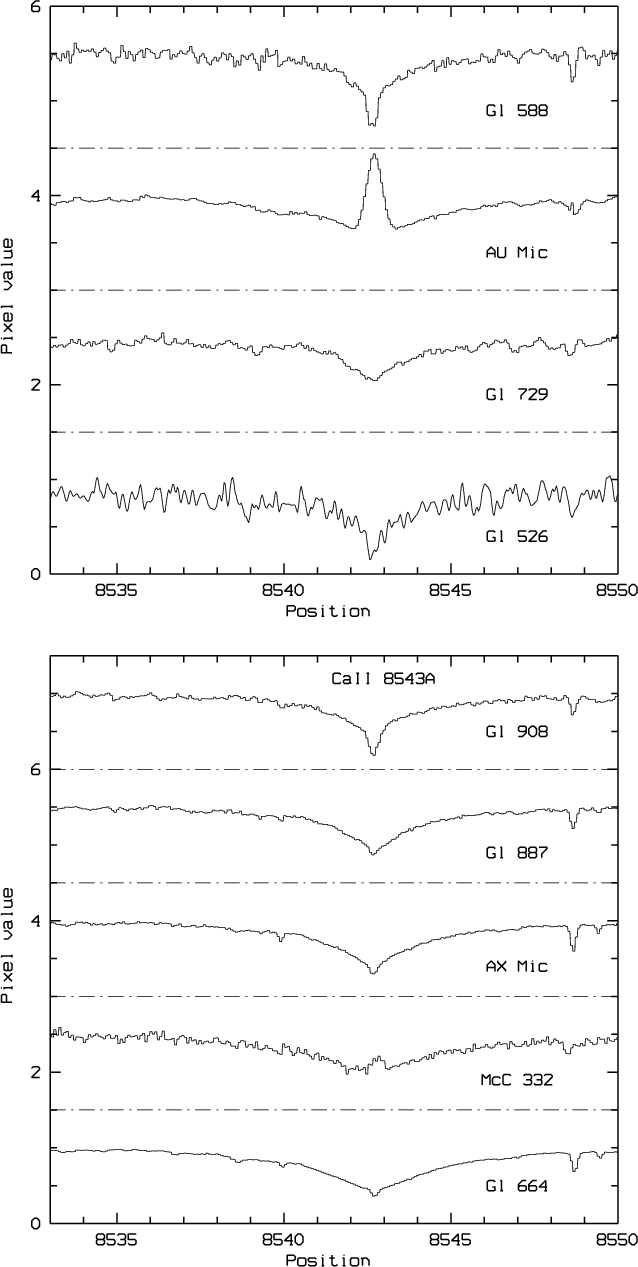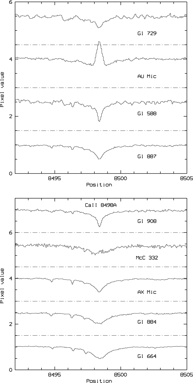 Pa8, CaII H, CaII IR triplet, CaI 6572Å, NaI D1/D2 and HeI D3 lines. We observed two dMe stars, one dM(e) star, 5 dM stars and 3 dK stars.