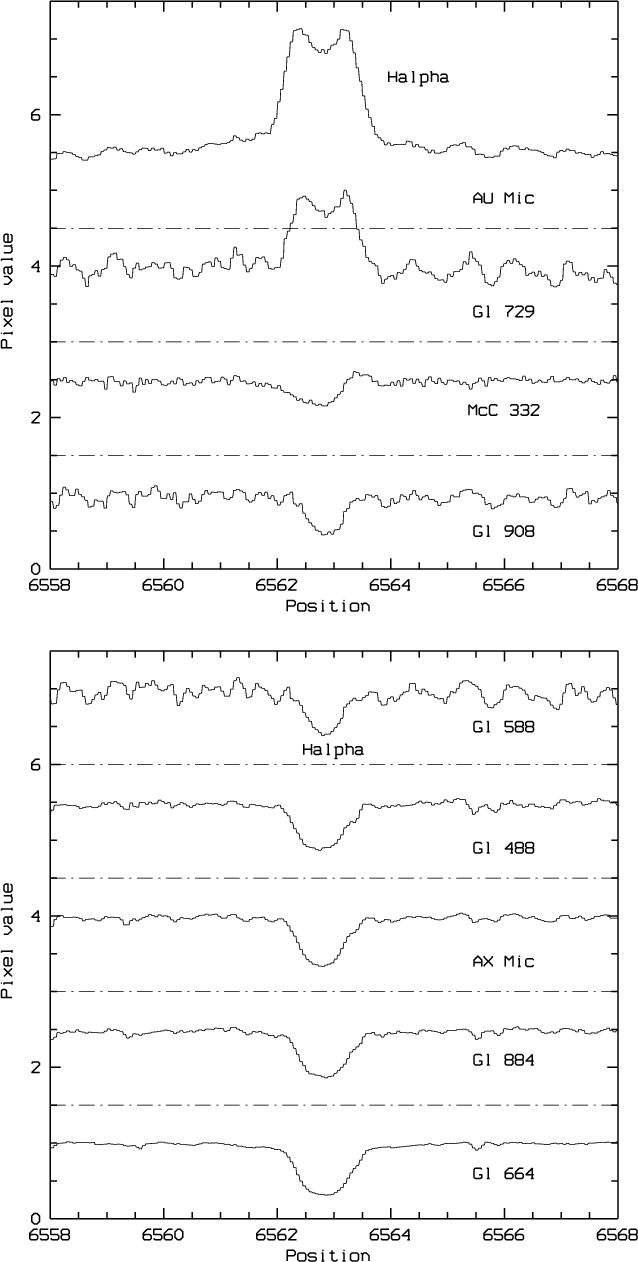 Subsequently, a substantial amount of work was carried out by the Armagh group (Houdebine 1990; Panagi 1990; Houdebine & Panagi 1990; Houdebine & Doyle 1994a,b; Doyle et al. 1994; Houdebine & Doyle 1995a; Houdebine et al. 1995; Houdebine & Doyle 1995b; Lanzafame 1995; Lanzafame & Byrne 1995; Houdebine et al. 1996; Short et al. 1997; Andretta et al. 1997; Short & Doyle 1998a,b; Jevremovic et al. 2000). Houdebine & Doyle (1994a,b, Papers I and II thereafter) studied in detail the modelling of the Balmer lines and the Lyman/Balmer flux ratio in the dM1e star AU Mic. They proposed for the first time a model that could reproduce these observations.
