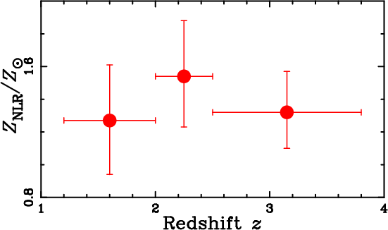 - The non-evolution in the gas metallicity of the NLRs implies that the major epoch of star formation in the host galaxies is at z > 5;
