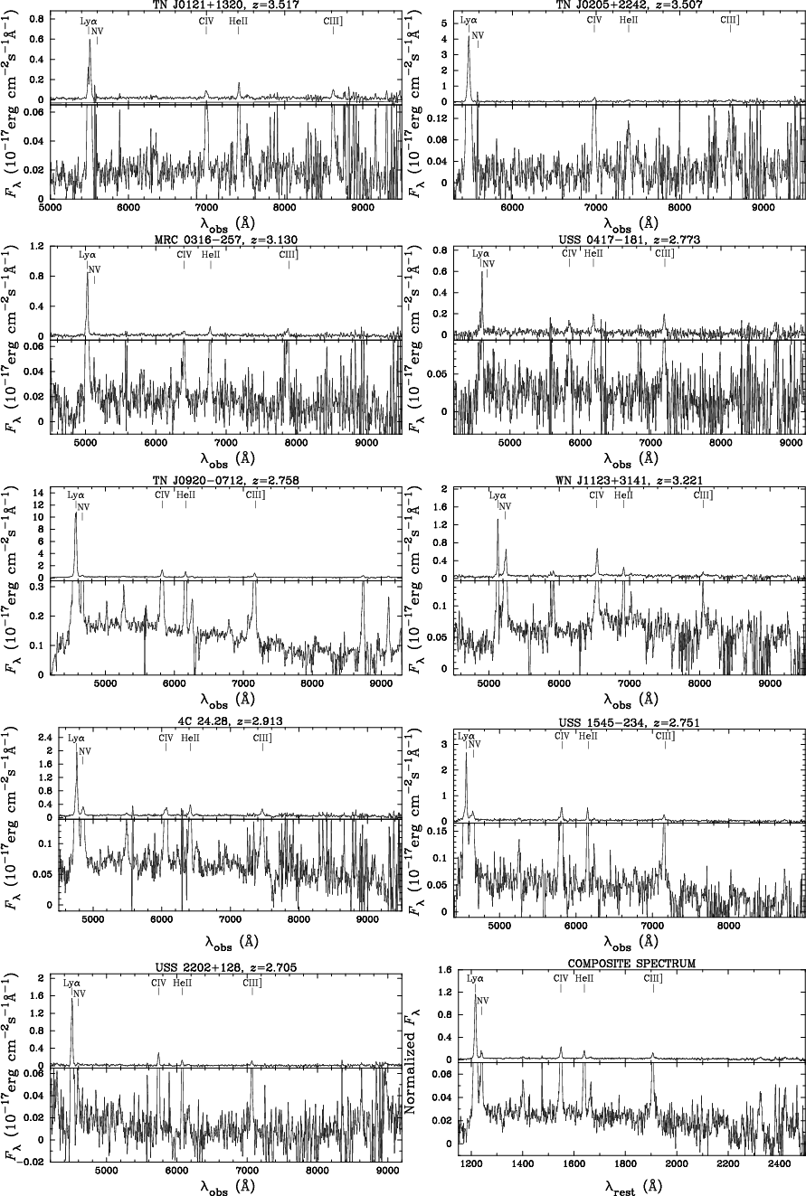 We observed 9 HzRGs at z > 2.7 with FORS2 (FOcal Reducer and low dispersion Spectrograph 2) at the VLT (Very Large Telescope). These targets were selected from the catalog of De Breuck et al. (2000), excluding HzRGs whose C IV, He II and C III] had already been measured. All the observations were executed in service mode. The list of target objects and an observation log is given in Table 1.