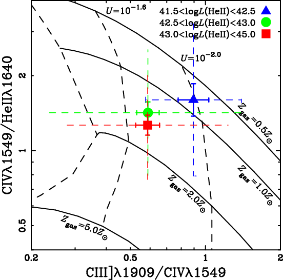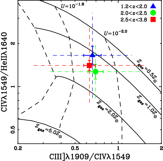 - Our analysis of the emission-line flux ratios of C IV, He II, and C III] suggests that there is no significant chemical evolution in the redshift range of