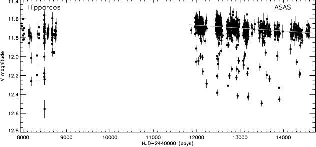 To characterize the SB2 in more detail, we retrieved photometric data of HIP 96515 A from both the Hipparcos archive (Perryman et al. 1997, 96 data points) and the All Sky Automated Survey, ASAS, (Pojmanski & Maciejewski 2005, 818 data points). The Hipparcos observations, in its own photometric system (Hip), were corrected with the relation
