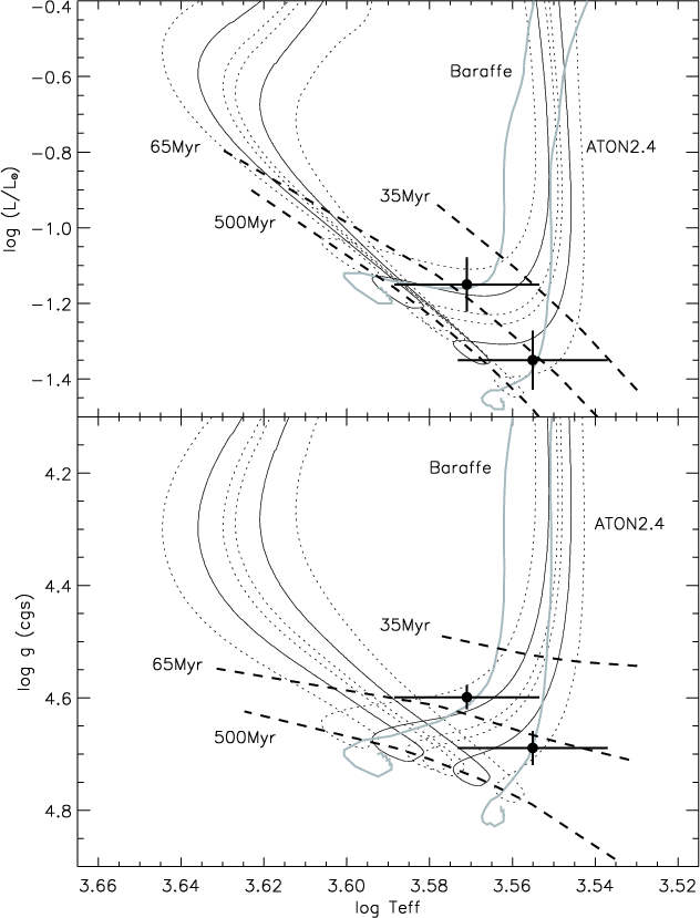 - A direct comparison of the EB members with evolutionary tracks (Landin et al. 2006; Baraffe et al. 1998) places them on the PMS with an age of