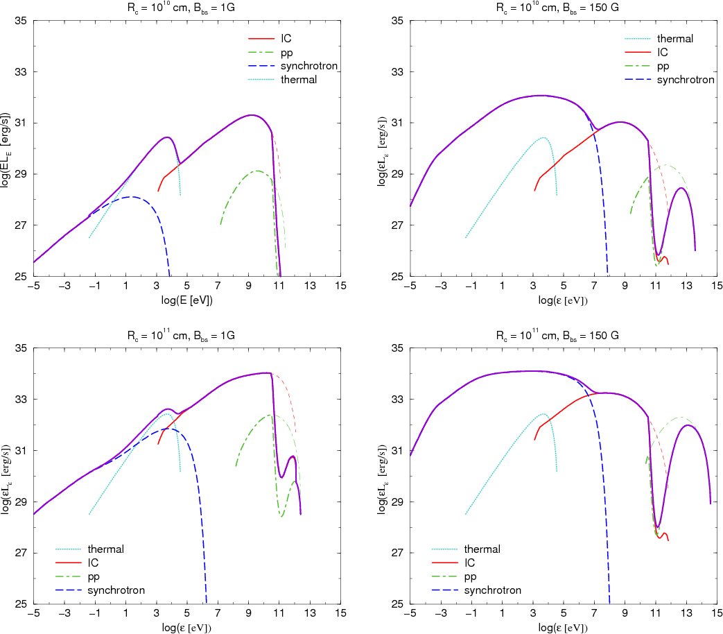 Results. Significant levels of emission in X-rays (synchrotron), high-energy gamma rays (inverse Compton), and very high-energy gamma rays (from the decay of neutral pions) are predicted, with luminosities in the different domains in the range