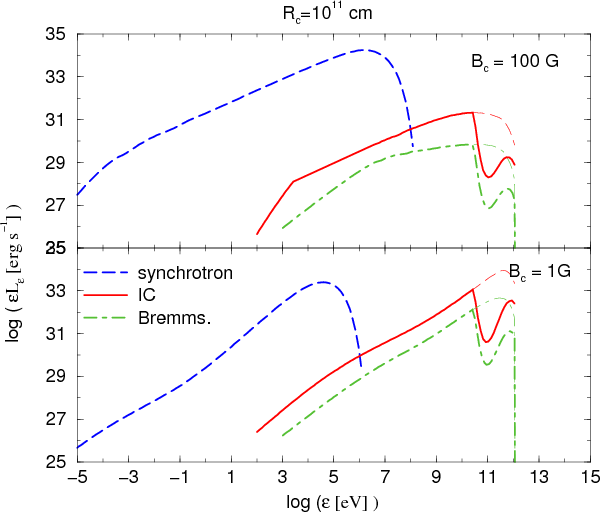 1033 erg s-1. Relativistic bremsstrahlung is negligible in all cases. The SEDs for