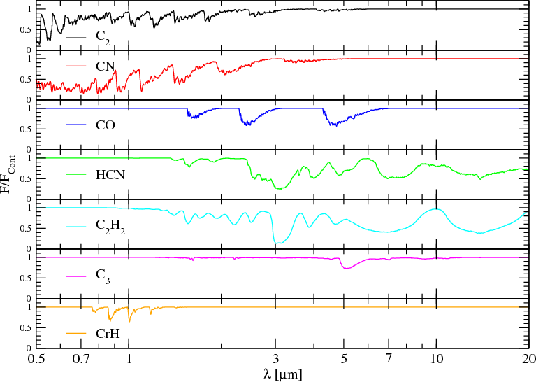 are dominated by C2, CN, C3, HCN and C2H2 (e.g. Querci et al. 1974; Jørgensen et al. 2000;