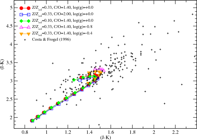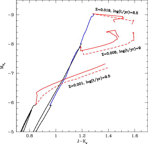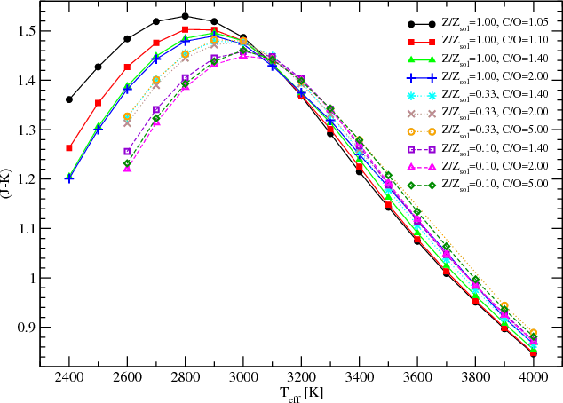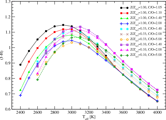 It is therefore very important that carbon stars are properly taken into account in models of galaxies. For this, two major ingredients are necessary. First, evolutionary tracks providing the distributions of luminosities, effective temperatures and surface compositions of the red giants as a function of age, initial mass and metallicity have to be available. Such calculations were presented for example in the work of Marigo & Girardi (2007). Secondly, one needs synthetic spectra including the circumstellar reddening by dust, which allow the conversion of the model quantities into observable properties of stars. The implementation of this can be found in Marigo et al. (2008).