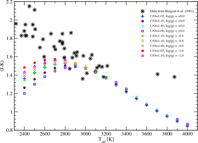 Conclusions. The warmer carbon stars with weak pulsation can be successfully described by our hydrostatic models. In order to include also the cooler objects with intense variations, at least a proper treatment of the reddening caused by the dusty envelopes is needed. This will be the topic of the second paper of this series.