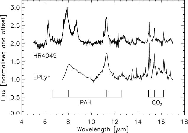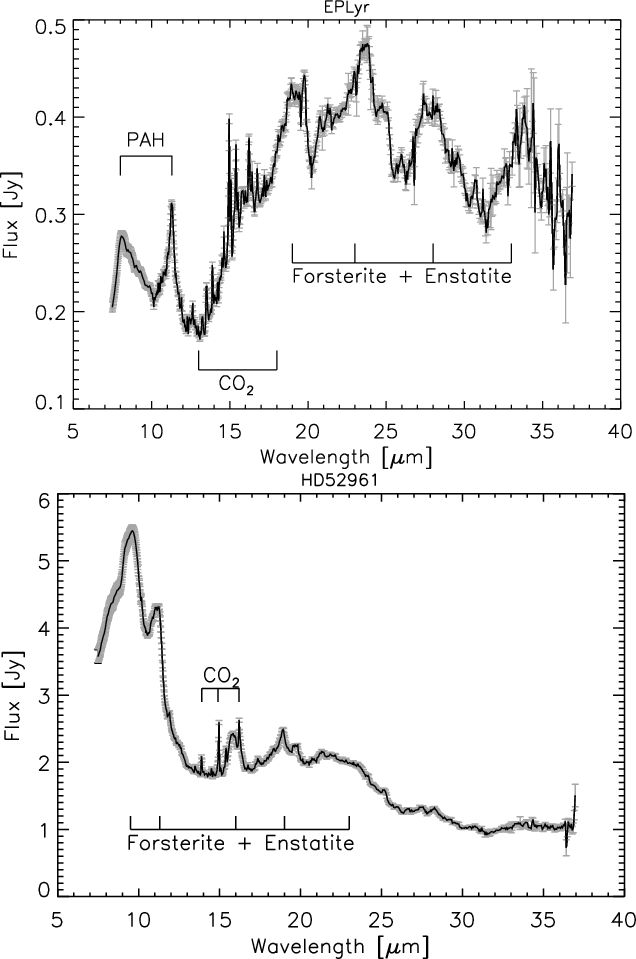 The outline of the paper is as follows: We start with a short description of the programme stars in Sect. 2. In Sect. 3 we give an overview of the different observations and reduction strategies. The analysis based on the Spitzer spectra is given in Sect. 4 and subdivided in different subsections. Section 4.2 contains a description of the silicate dust features and the modelling of the Spitzer-IRS spectra. The CO2 gas features are discussed in Sect. 4.3 and the observed PAH features in EP Lyr in Sect. 4.4. In Sect. 5 we model the observed SEDs using a passive disc model, also constrained with MIDI interferometric measurements. The discussion of our different results and our conclusions are presented in Sect. 6.