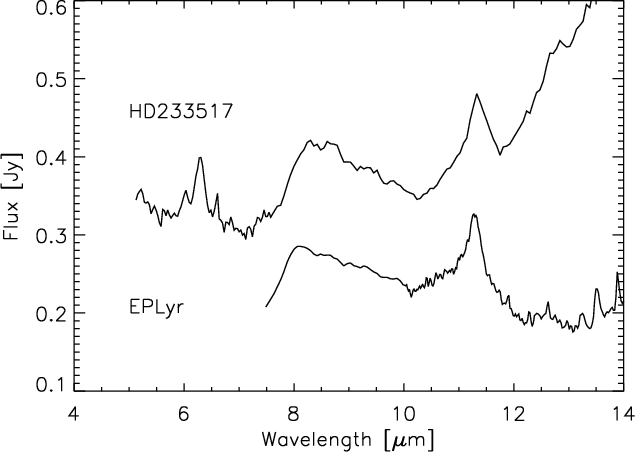 Some evolved objects show, however, features of both O-rich and C-rich dust species in their spectra. They are called mixed chemistry sources. This chemistry is detected in several sources in a wide range of different evolutionary stages. Some examples include Herbig Ae stars, or AGB stars, such as J-type carbon stars with silicate dust emission (Lloyd Evans 1990; Little-Marenin 1986). Others are red giants, for example HD 233517, an evolved O-rich red giant with PAHs in a circumstellar disc (Jura et al. 2006). Other examples are planetary nebulae (PNe) with evidence of silicates and PAHs (Kemper et al. 2002; Gutenkunst et al. 2008), or the hydrogen-poor [WC] central stars of PNe (Cohen et al. 1999; Waters et al. 1998). Also some M supergiants are associated with emission due to PAHs (Sloan et al. 2008; Sylvester et al. 1998).