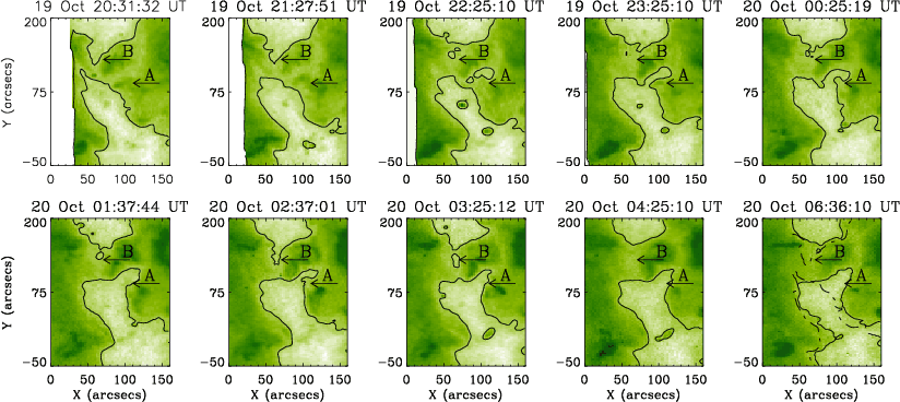 The CH2 is presented in Fig. 5 with images taken at almost regular time intervals (e.g. 01:12, 02:00, 02:50, 03:38, 05:15 and 06:49 UT). The two over-plotted boxes (a and b) have the enlarged FOV shown in Figs. 6 and 7. In Fig. 6 one can see that formation of a new BP (arrow A) led to contraction of the CH while the disappearance (arrow B) again expanded the CH. In Fig. 7 the disappearance of two BPs is followed by a large increase of the CH region.