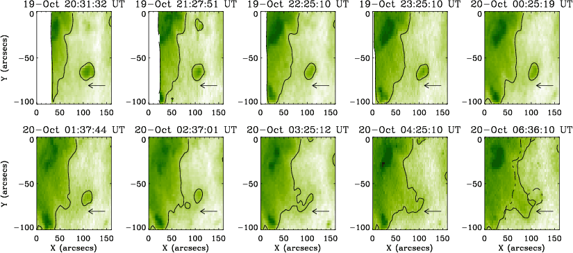 The images were taken from 20:00 UT (19 October) until 06:00 UT (20 October) every 15 min (except at 05:00 UT). Additionally, we selected full-disk data covering 48 h of observations from 15:00 UT on October 18 until 15:41 UT on October 20 taken approximately every 2 h. All data related to CH1 were derotated to 07:00 UT on October 20. The data from November 1999 were taken from 15:00 UT on November 3 until 15:00 UT on November 5 and de-rotated to 15:00 UT on November 5. Both datasets have a 5.2