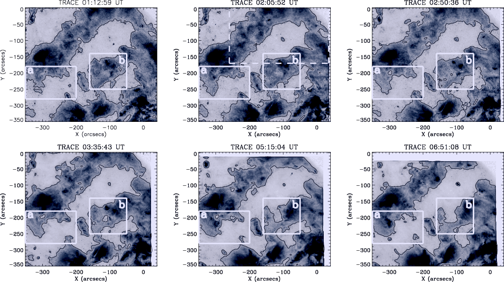 Figure 5: Reversed color TRACE 171 Å images showing a partial field-of-view of CH2 observed in November 1999. The over-plotted rectangular areas (a and b) are shown enlarged in Figs. 6 and 7. The dashed line box corresponds to the field-of-view presented in Fig. 8. |
