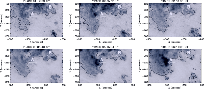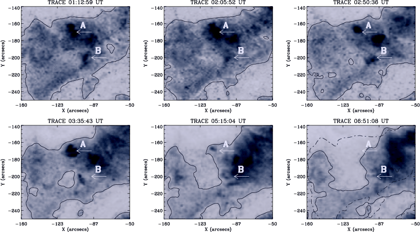 Figure 7: TRACE 171 Å images marked with ``b'' in Fig. 5 showing a large expansion of the coronal hole due to the disappearance of two BPs (arrows A and B). The over-plotted dashed-dotted line shows the boundary from the first image. |