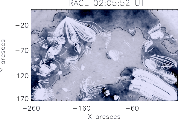 Figure 8: TRACE 171 Å image with a field-of-view as shown in Fig. 5 with over-plotted only closed magnetic field lines connecting magnetic polarities above 20 G. The magnetic field lines were obtained with a potential magnetic field extrapolation (Wiegelmann et al. 2005). |