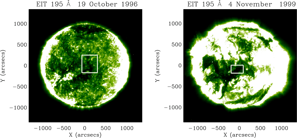 Figure 1: Full-disk EIT 195 Å images obtained on 1996 October 19 and 1999 November 4. The over-plotted boxes outline the field-of-views subjected to detailed study. |