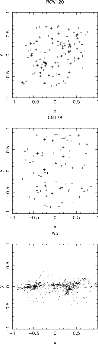 Figure 2: Position data for the protostars referred to in the text. Top, RCW120, middle CN 138. Bottom the types I and II protostars from the W5 region. All the positions have been normalised by centreing on the mean position of the cluster members, and then setting the distance from the centre to the furthest star to be one distance unit. |