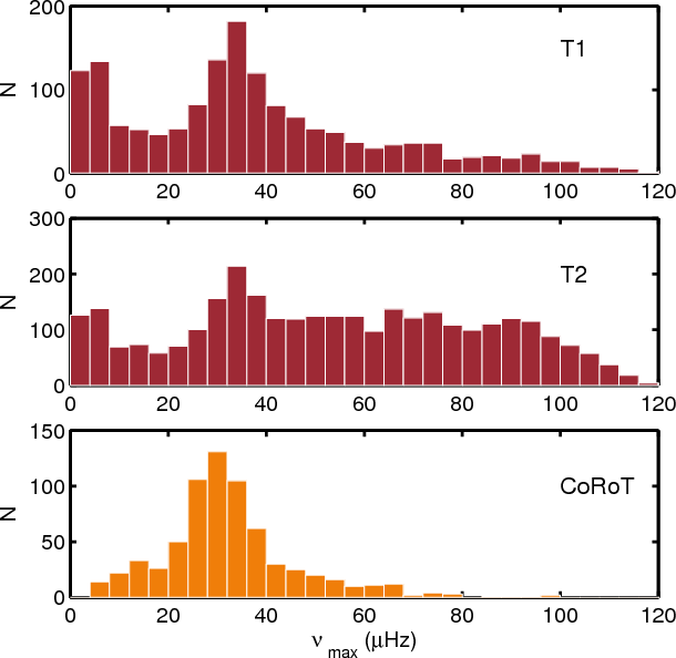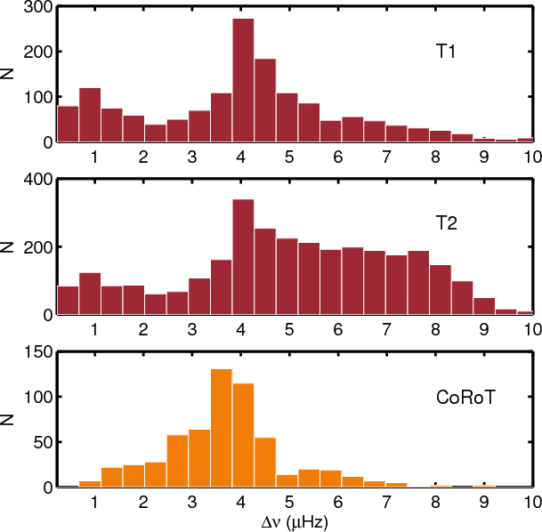 Hz, respectively. The corresponding histograms are also shown in the lower panels of Figs. 3 and 5. We note, however, that the detection of solar-like pulsations as in the low-frequency end (
