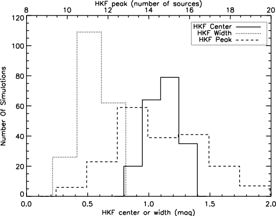 The first alternative approach that we tried to follow was PSF-fitting photometry that should be less affected by these problems. We chose a subsample of test fields with different levels of stellar crowding. In this procedure, an important aspect was the modeling of the PSF. To test this, we completed several trials selecting a variable number of point-like sources (from 3 to 30) of different brightness levels and different positions in the field. We found that the resulting PSF model was not particularly sensitive to the choice of numbers and/or brightnesses of the stars. However the results, were quite dependent on the mean stellar density of the field. The photometry was carried out using the ALLSTAR task, which was particularly suited to crowded fields. However, we also tested the other two tasks (PEAK and NSTAR) and obtained comparable results for most of the sources. We note, however, that in the most crowded areas in particular, the subtraction of the PSF-fitted sources from the image introduced two spurious effects: an unacceptably high level of residuals with brightness levels well above the detection threshold used and a significant number of negative holes, indicating that the PSF-fit included some background in the source flux estimation and therefore overestimated its value. Both effects are caused by both the limited accuracy of the PSF model that can be obtained for very crowded fields, where faint neighboring stars can enter the area where the PSF model is estimated, and the presence of a significant and variable background, which is quite common and expected for the Galactic plane. A similar conclusion was reached by Hillenbrand & Carpenter (2000) in their study of the inner Orion Nebula Cluster.