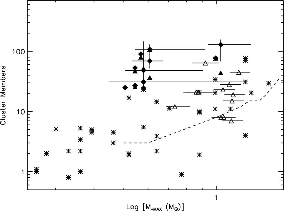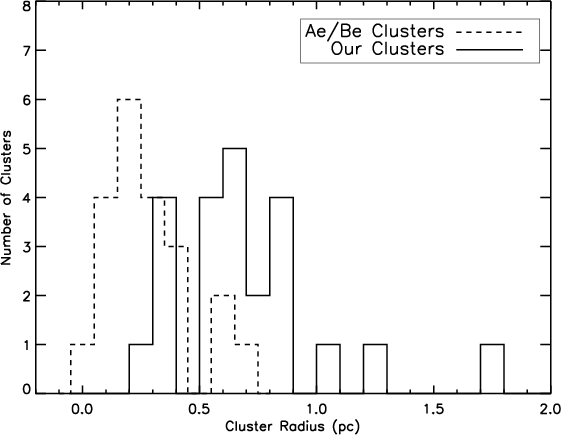 years, with evidence of an age spread of the same entity within each cluster. We also find evidence that older clusters tend to be smaller in size, in agreement with our clusters being on average larger than those around relatively older Herbig Ae/Be stars. Our models allow us to explore the relationship between the mass of the most massive star in the cluster and both the cluster richness and the total stellar mass. Although these relationships are predicted by several classes of cluster formation models, their detailed analysis suggests that the properties of our modeled clusters may not be consistent with them resulting from random sampling of the IMF.