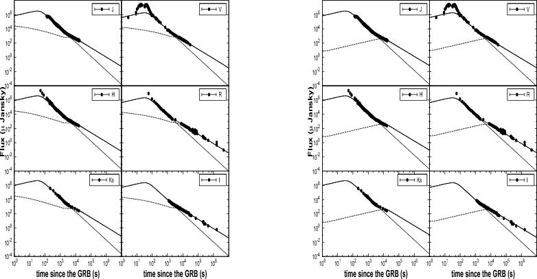 Figure 3: The contributions by the RS and FS to the GRB 080319B afterglow at optical-NIR bands are represented by using the dashed and dotted lines, respectively. The addition of the two components is shown using the solid line. The left and right panels are WM and ISM models, respectively. |