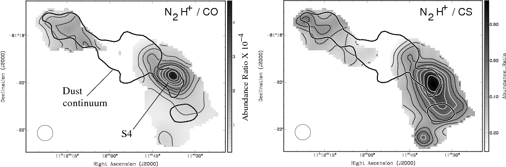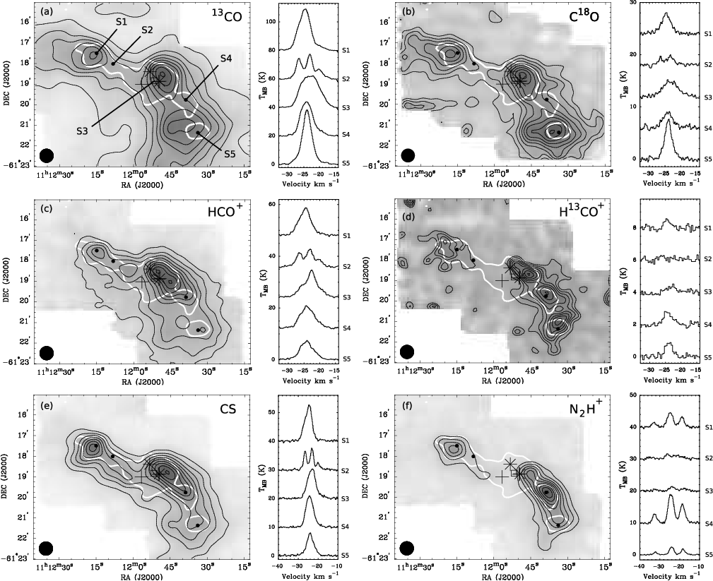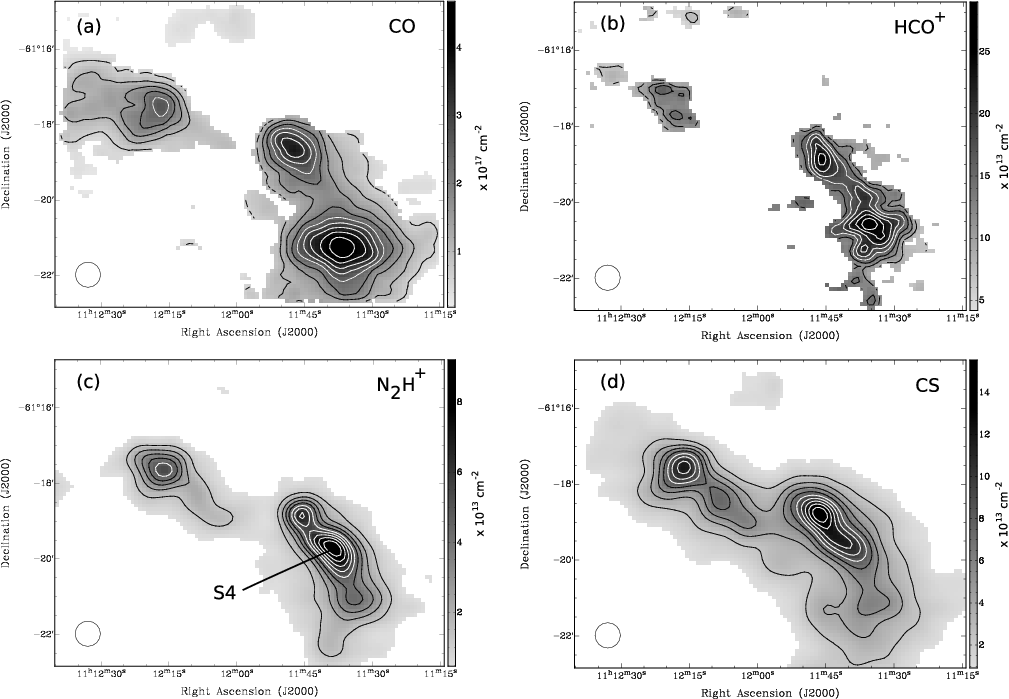 A column density map of CS was prepared in a similar manner, although we note that our assumption of optically thin emission may not be valid. Judging by the non-Gaussian shapes of some line profiles, regions with strong emission may have significant optical depths.