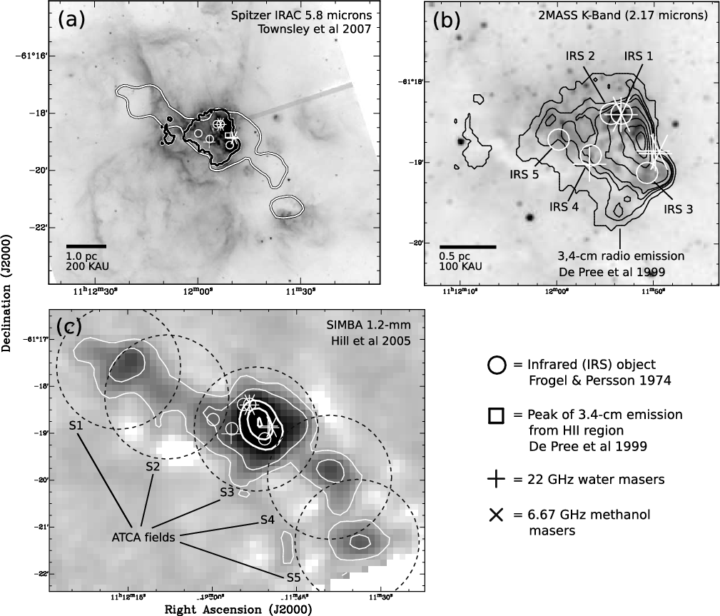 There is controversial evidence for sequential star formation in NGC 3576. Persi et al. (1994) showed that a steep near-IR colour gradient exists in the embedded cluster, with the reddest, most deeply embedded sources in the west. This implies that star-formation began in the east, gradually moving to the location of the strong radio peak in the west. Such an interpretation is supported by the existence of an electron temperature gradient in the ionised gas (de Pree et al. 1999) indicating that the youngest and hottest stars are located near the sharp western edge of the H II region (Hjellming 1966). High helium abundance in the east may also indicate the presence of a population of older stars and their mass loss (Hanson & Conti 1993). Bright 22 GHz water masers, commonly found in outflows, have been found adjacent to the main radio peak (Caswell 2004), while Norris et al. (1993) also detected two 6.67 GHz methanol maser sites near IRS 1 and IRS 3. Shocked molecular hydrogen emission was measured peaking towards IRS 1 by Oliva & Moorwood (1986), also pointing to the existence of outflows. IRS 1 was later resolved into three components by Moneti (1992) and Barbosa et al. (2003), one of which is seen through scattered light from a cavity or a dusty disk (Moneti 1992). None of the detected infrared sources contributes significantly to the ionisation of the H II region, (Barbosa et al. 2003), however, recent Chandra observations (Townsley 2006) have revealed multiple deeply embedded hard X-ray sources, which may provide the extra ionisation needed.