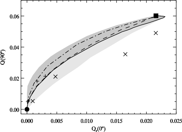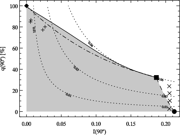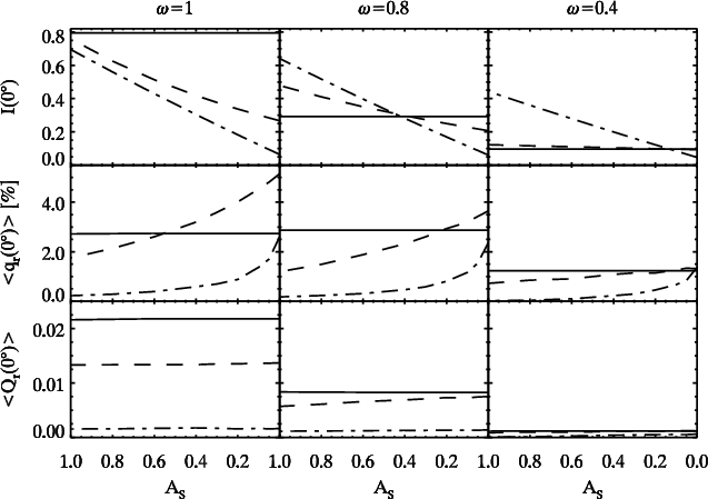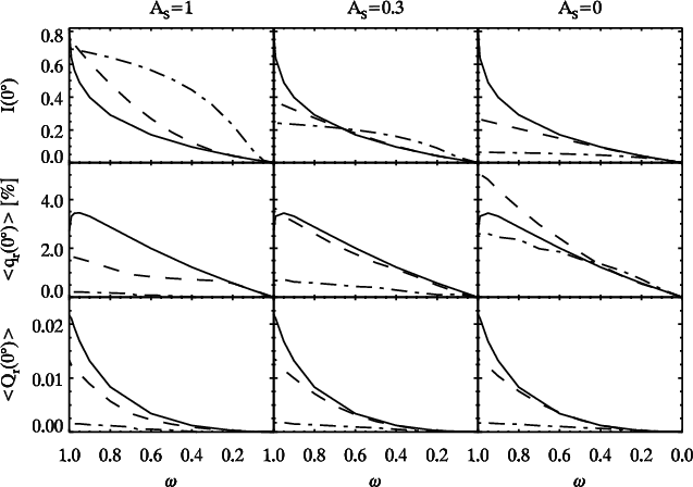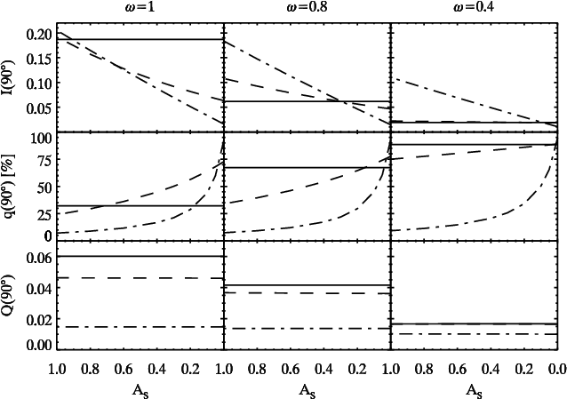 - the limb polarization at opposition for semi-infinite Rayleigh scattering atmospheres with different single scattering albedos derived from formulas and tabulated functions given in Abhyankar & Fymat (1970, 1971) and Chandrasekhar (1950);