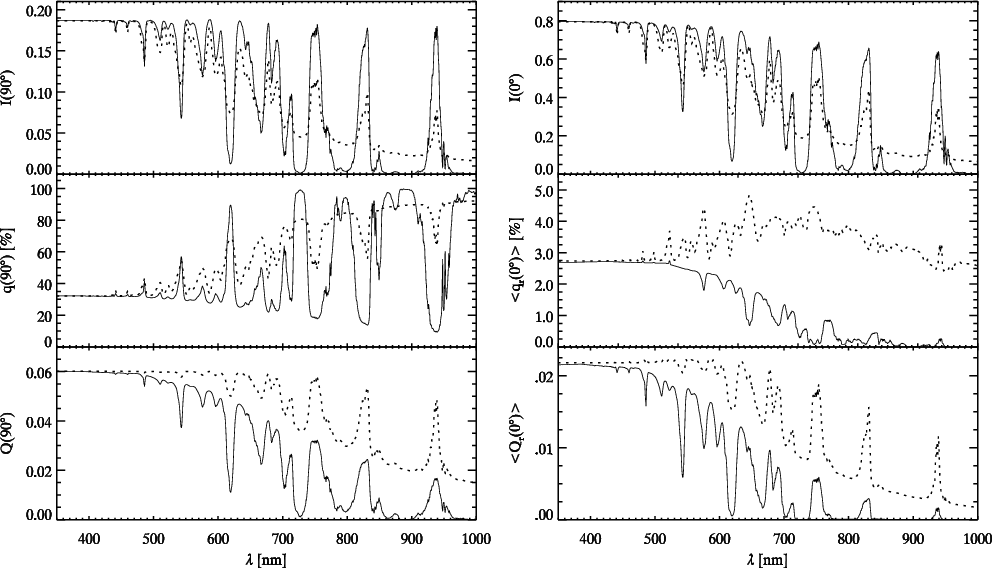 Conclusions. The model grid provides a tool for extracting quantitative results from polarimetric measurements of planetary atmospheres, in particular on the scattering properties and stratification of particles in the highest atmosphere layers. Spectropolarimetry of solar system planets offers complementary information to spectroscopy and polarization flux colors can be used for a first characterization of exoplanet atmospheres.