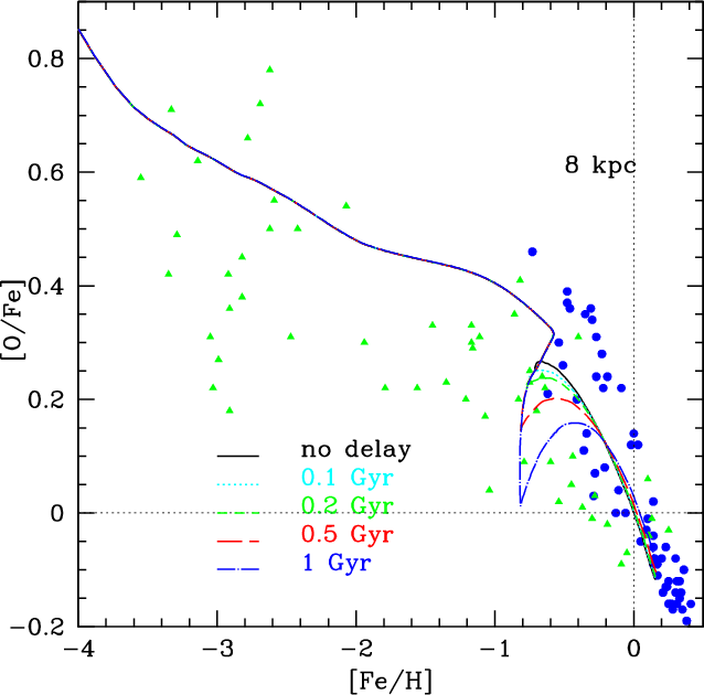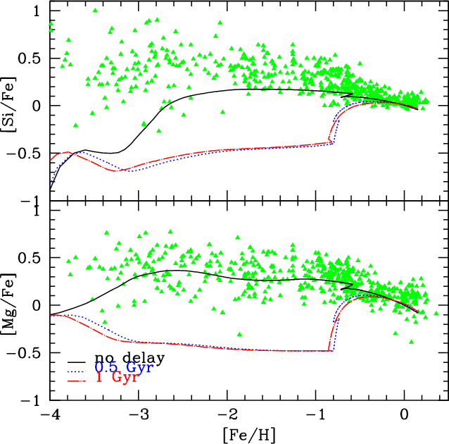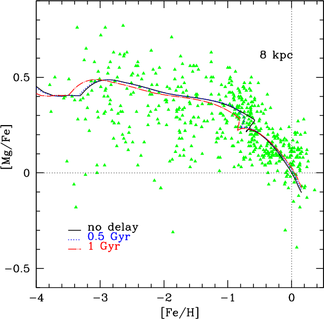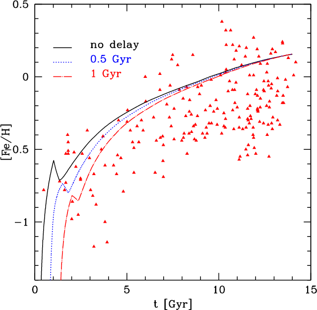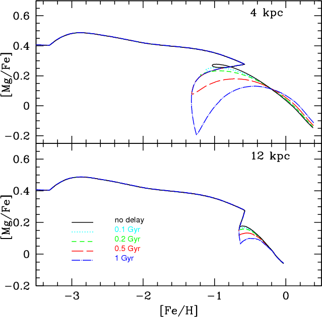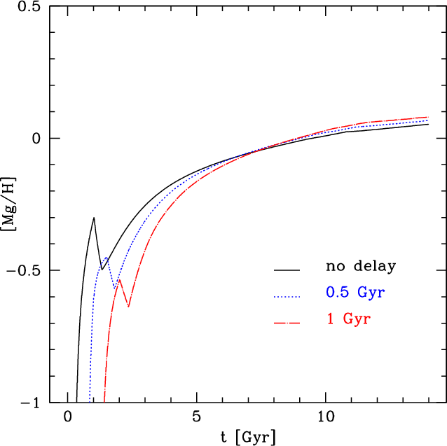 One of the very few studies in which IMA has been relaxed is the one of Thomas et al. (1998). They proposed a model in which relaxing IMA was included by splitting the gas components into two different phases: the inactive and active gas phases. The first one consists of a hot and not homogeneously distributed component; stars cannot form out of this phase. The active phase is instead assumed to be cool and well mixed. They discussed various time-scales for the mixing of the stellar ejecta, and they found that a delay of the order of 108 years leads to a better fit of the observational data in the [Mg/Fe]-[Fe/H] diagram than in the IMA hypothesis.
