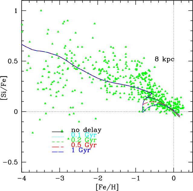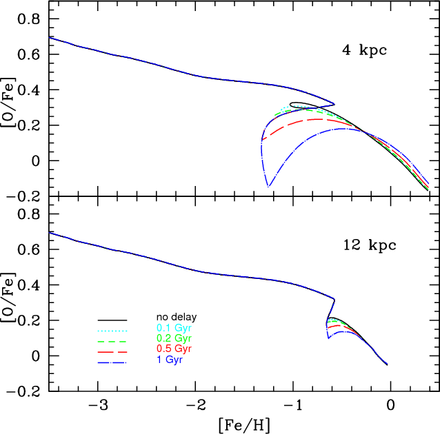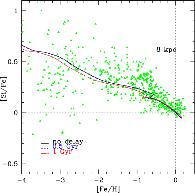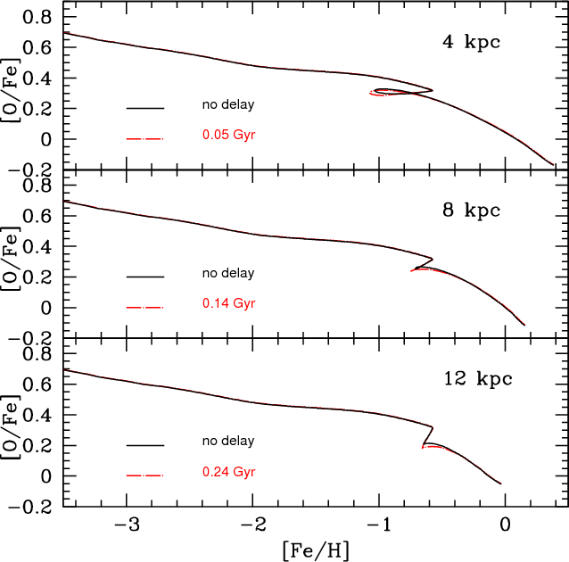Here, we simply implemented our ``metal cooling delay model'' in the detailed chemical evolution model of F04 by means of a delay in the chemical enrichment.