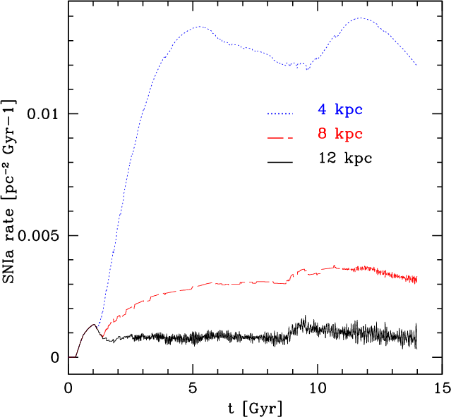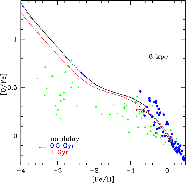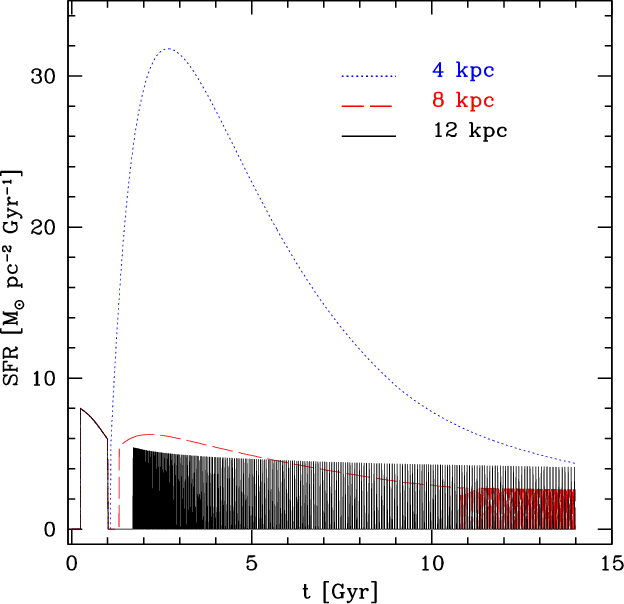 In the model of F04, the Galaxy is assumed to have formed by means of two main infall episodes: the first formed the halo and the thick disk, the second the thin disk. The time-scale for the formation of the halo-thick disk is 0.8 Gyr and the entire formation period does not last more than 2 Gyr. The time-scale for the thin disk is much longer, 7 Gyr in the solar vicinity, implying that the infalling gas forming the thin disk comes mainly from the intergalactic medium and not only from the halo (Chiappini et al. 1997). Moreover, the formation timescale of the thin disk is assumed to be a function of the galactocentric distance, leading to an inside out scenario for the Galaxy disk build-up (Matteucci & François 1989). The galactic thin disk is approximated by several independent rings, 2 kpc wide, without exchange of matter between them.