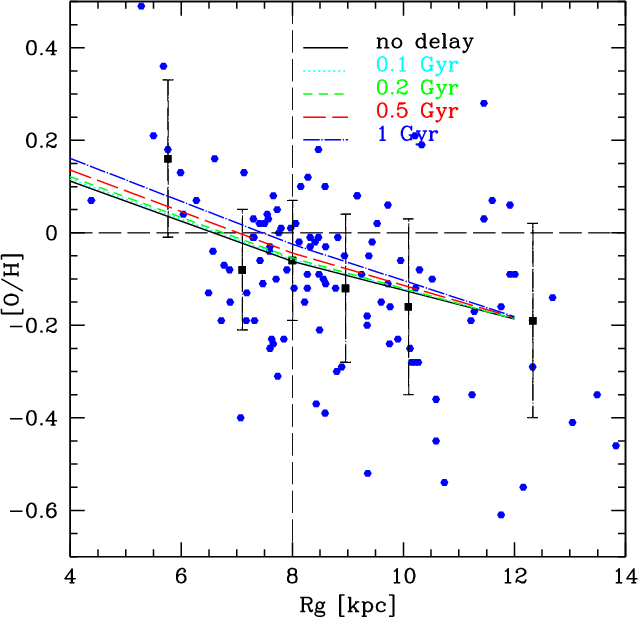 Methods. We considered various galactic fountain time delays for the chemical enrichment from massive stars. We then tested a time delay in the enrichment from stars of all masses due to gas cooling in the range 0.5-1 Gyr.