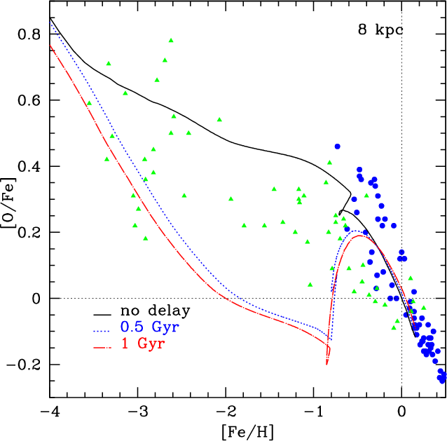 The paper is organized as follows: in Sect. 2 we describe the reference model of F04, in Sects. 3 and 4 we report the nucleosynthesis prescriptions and the observational data, respectively. In Sect. 5 we present our galactic fountains delay model, and in Sect. 6 the ``metal cooling delay model''. In Sect. 7 we report and discuss our results. Finally, we draw the main conclusions in Sect. 8.