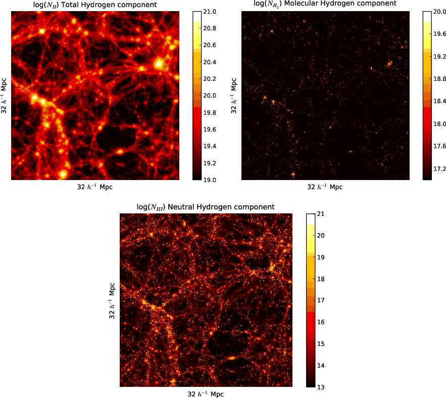 Methods. Beginning with a 32 h-1 Mpc simulation, we extract the neutral hydrogen component by determining the neutral fraction, including a post-processed correction for self-shielding based on the thermal pressure. We take molecular hydrogen into account, assuming an average density ratio