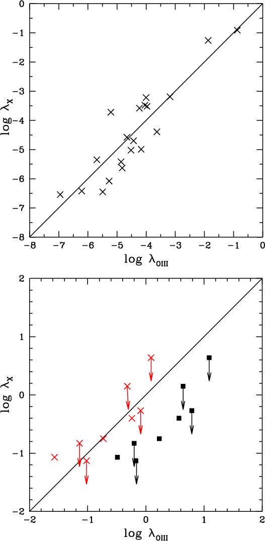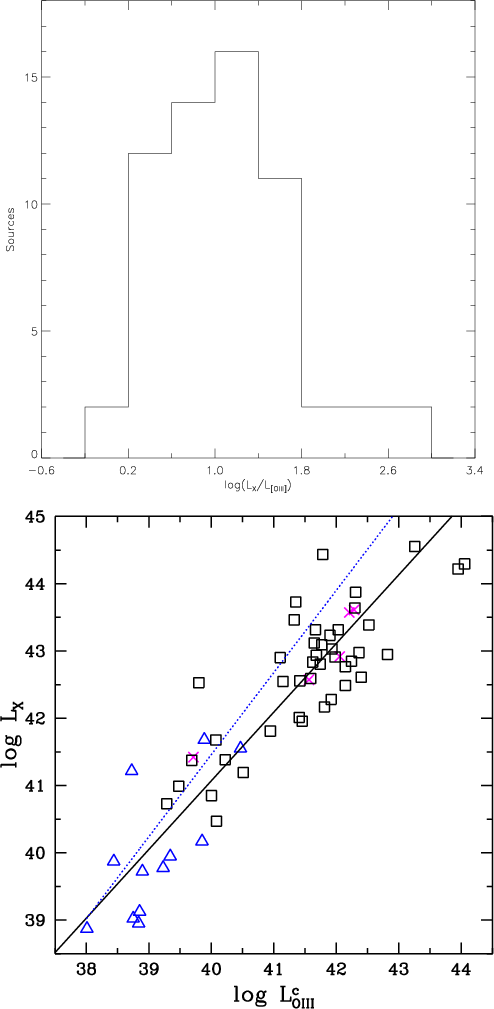 being affected by extinction, most likely from dust within the narrow line region. The extinction-corrected [OIII] luminosity (