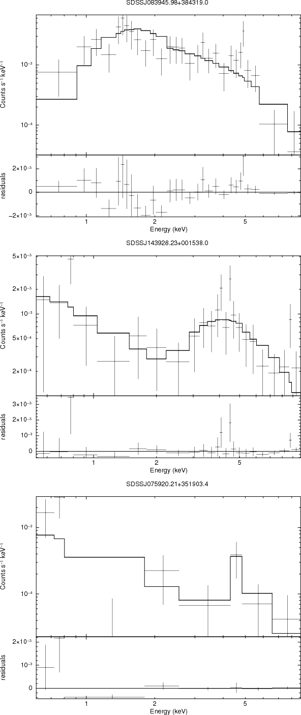 Sufficient counts for a spectral fitting in the 2-10 keV band were only collected from three sources: SDSSJ075920.21+351903.4, SDSSJ143928.23+001538.0, and SDSSJ083945.98+384319.0.