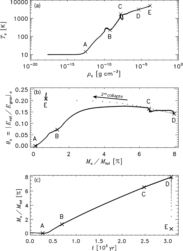 In the past two decades, various attempts have been made to follow the 2-D and 3-D collapse of rotating protostellar fragments by means of extended numerical calculations (e. g., Saigo et al. 2008; Bodenheimer et al. 1990; Yorke et al. 1993; Boss 1989) based on grid-methods, by a solution method based on a series development into orthogonal polynomials (Tscharnuter 1987), and by studies based on the SPH-method (e.g., Stamatellos et al. 2007).