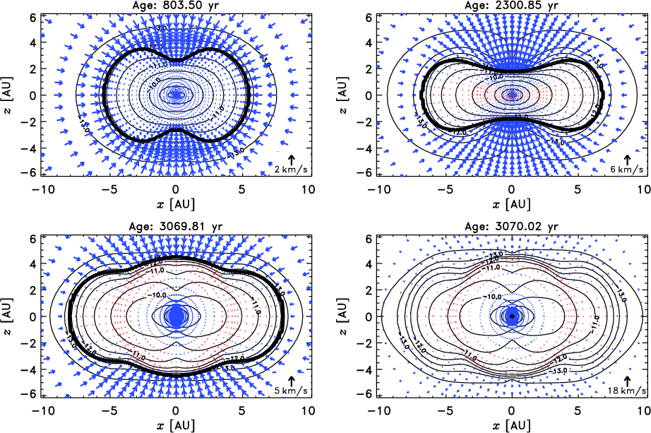 Figure 1: Meridional cross sections. Displayed are equi-density contours (annotated numbers are logarithms of the density in g cm-3), the spacing being 0.5 dex, and arrows representing the velocity field. Red ``spots'' indicate expansion (cf. Fig. 3a). The closed heavy line marks the accretion shock, and the arrow at the lower right corner of the four panels represents the respective maximum infall velocities. Upper row: snapshots slightly after B and before C, respectively. Lower row: snapshots for D and E (cf. Fig. 2). At E ( right panel), two shocks, an outer and an inner one, bounding the growing ``pre-planetary'' disk and the ``stellar'' core, respectively, coexist (the two shocks are not displayed here, but cf. Fig. 4 for the formation of the stellar core). |
