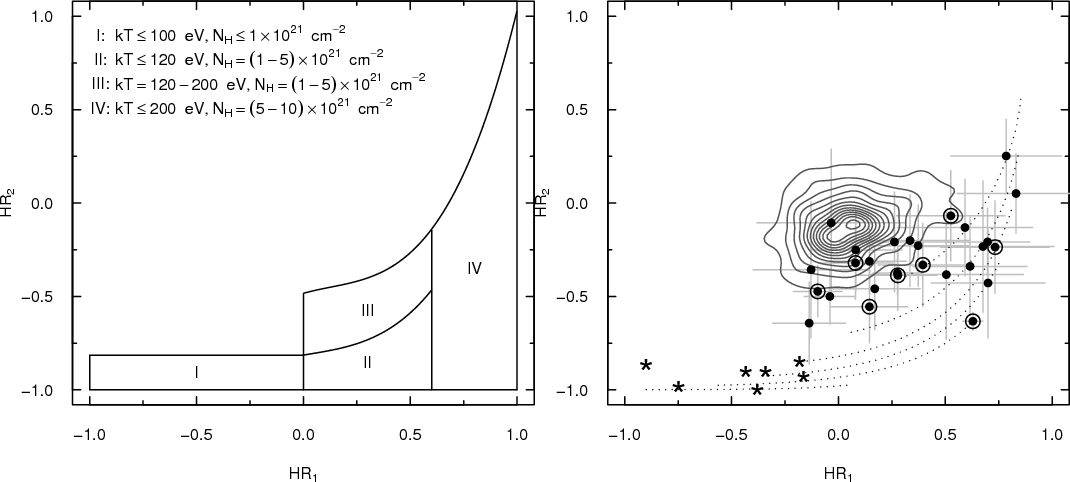 HR4 diagram as well so as to avoid X-ray sources with significant emission above 2 keV. For each source in these regions, we visually checked the X-ray and optical images